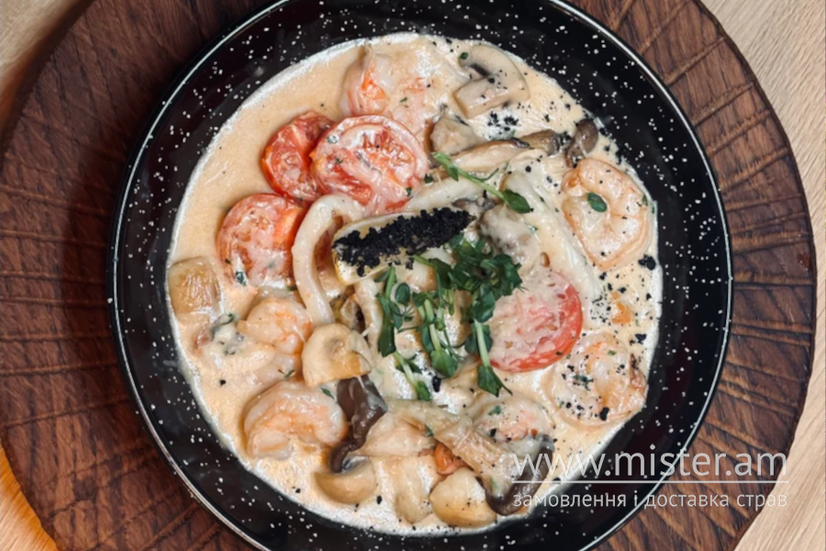 Запечені кальмари, креветки, мідії, гливи, грінки з білого хліба під вершковим соусом з додаванням блакитного сиру.