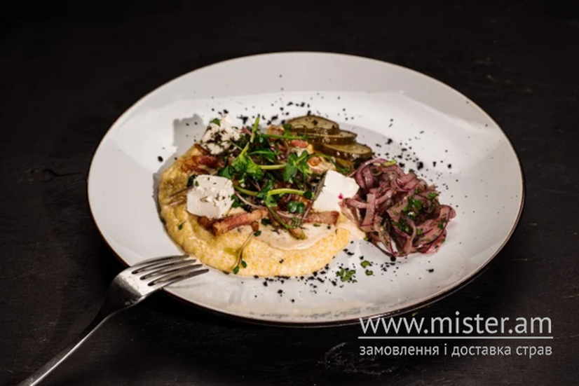 Колоритна гуцульська страва з кукурудзяної крупи, заправлена хрустким беконом та фетою та печерицями з вершками.