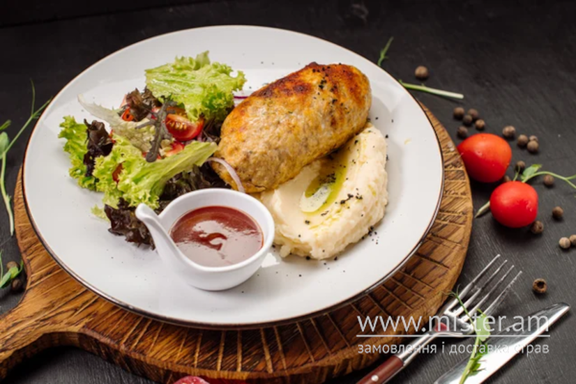 Картопляне пюре з соковитою смаженою курячою котлетою та соусом BBQ.