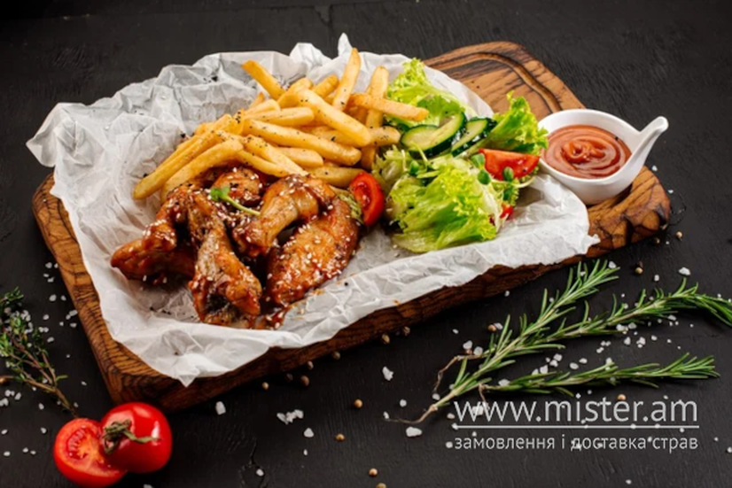 Пікантні курячі крильця у соусі “Баффало” з картоплею по-селянськи.