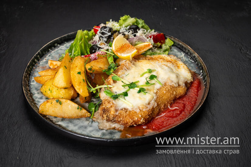 Ніжна куряча грудка, запанірована та запечена у смачному томатному соусі, моцарелою та пармезаном, подається зі свіжим салатом на основі каперсів, оливок та печеною картоплею