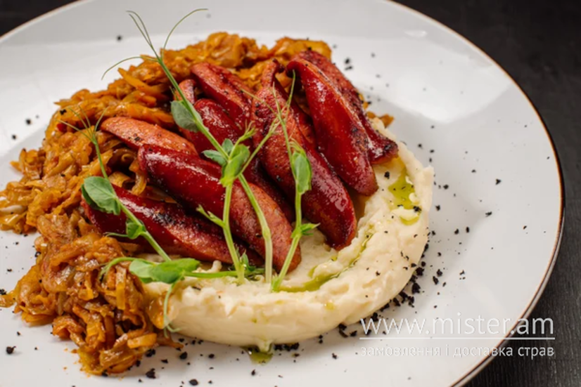 Тушкована капуста з копченими ковбасками та картопляним пюре