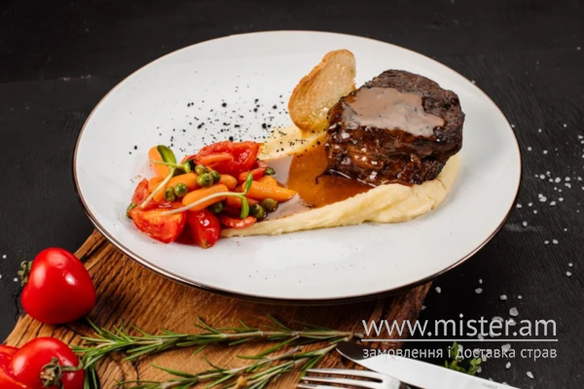 Ніжна вирізка з яловичини, полита трюфельним соусом “Деміглас”. Подається з картопляним пюре та овочами або овочами-гриль.