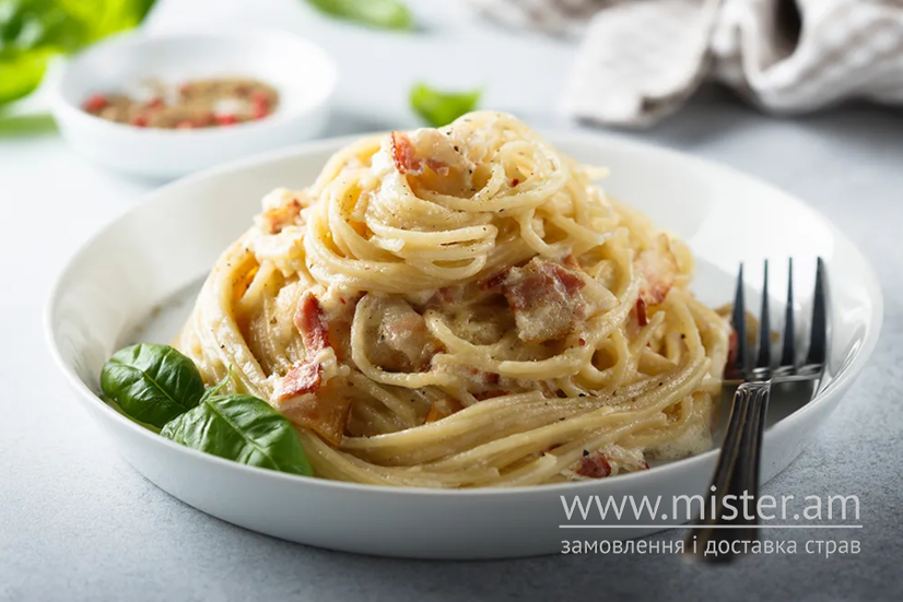 Паста з соусом на основі яєчних жовтків та сиру пармезан, із смаженим беконом та ароматним свіжозмеленим перцем.