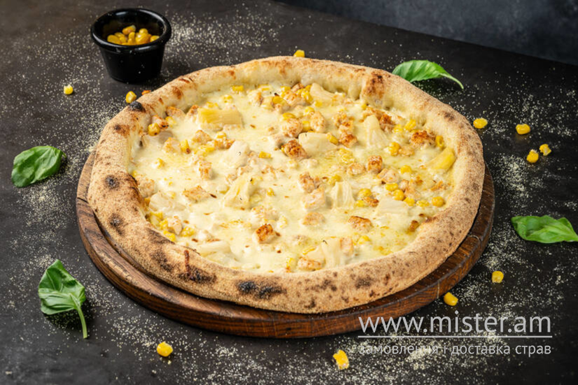 Вершковий соус, ананаси, кукурудза, сир моцарела, куряче філе, зелень.