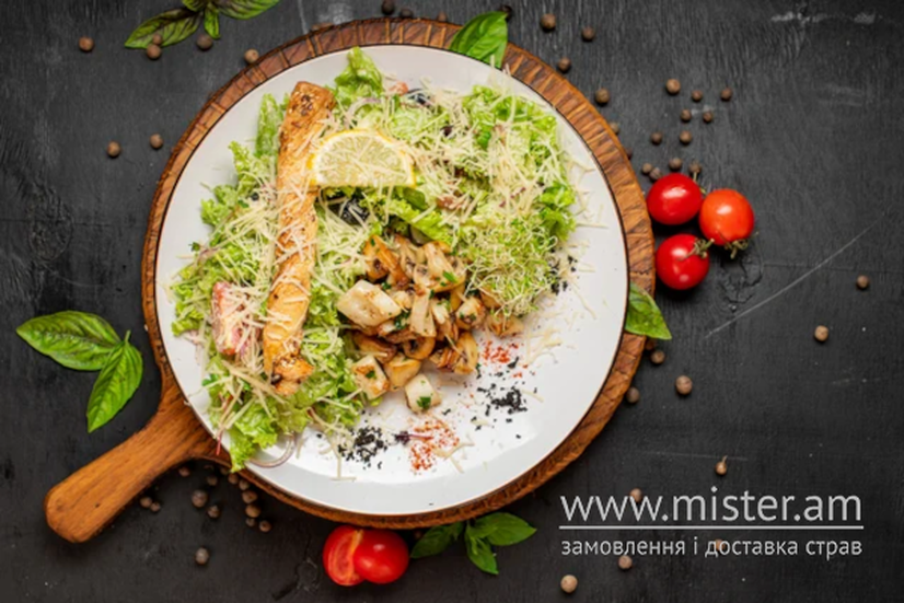 Ніжні кільця кальмара в поєднанні з оливками, шампіньйонами, сиром пармезан та листям салату. Заправлені середземноморським соусом.