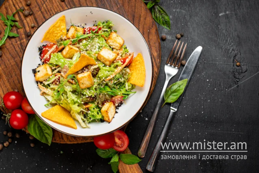 Слайси качиної грудки, сир панір, огірок, томати чері, морква, дайкон, салат з гірчично-лимонним соусом.