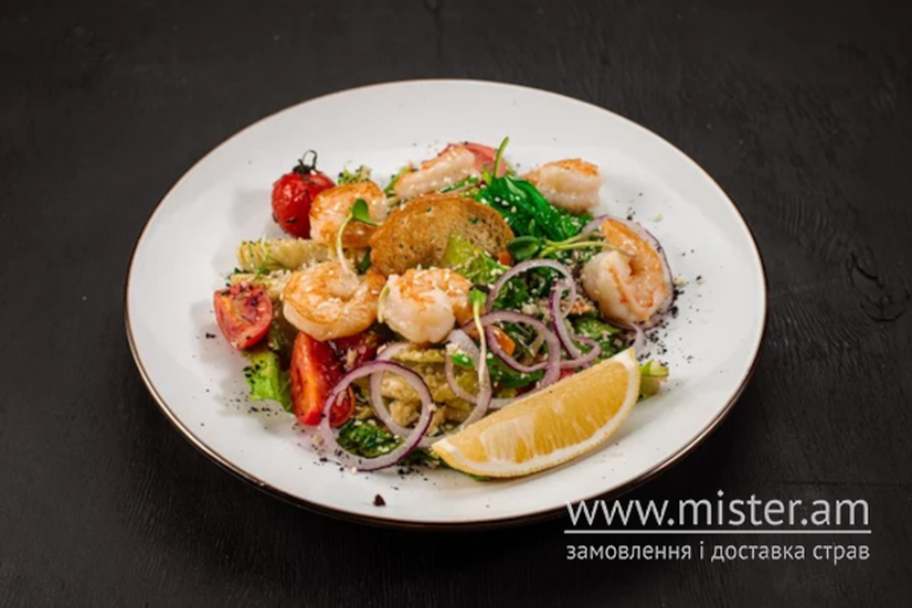 Грильовані креветки на подушці з салату та водоростей чука, томатами чері, стеблом селери, морквою синьою цибулею та дайконом заправлені арахісовим соусом.