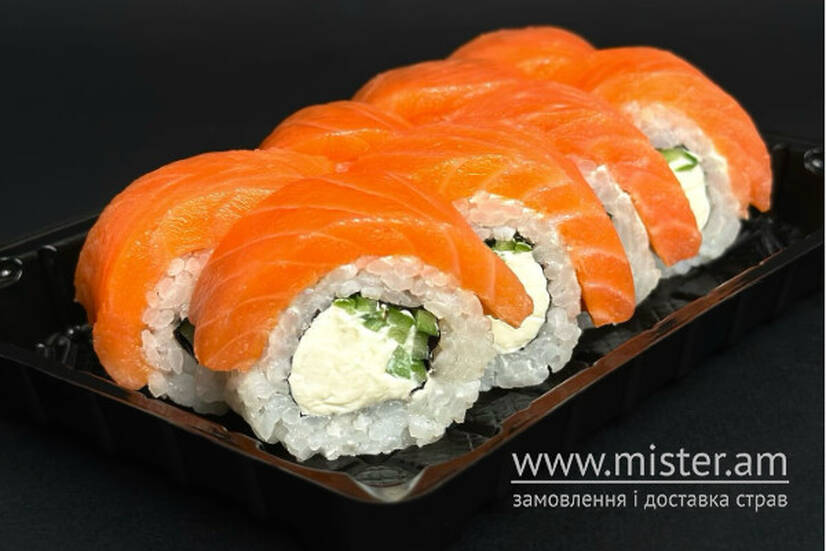 Рис, огірок, сир філадельфія, копчений лосось.