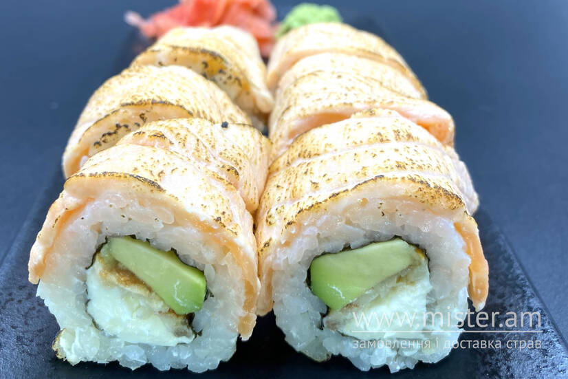 Рис, печений лосось, вугор, авокадо, вершковий сир.