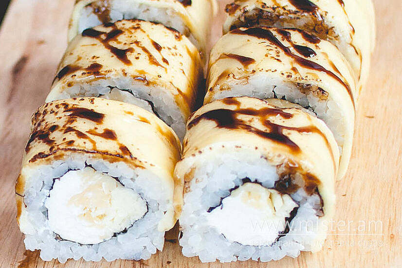 Рис, сир вершковий, моцарела, твердий, сир тостовий обпалений, соус бальзамічний.