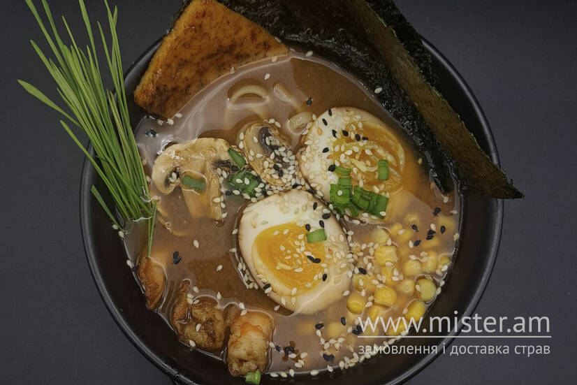 Бульйон місо, локшина удон, мариновані яйця, тигрова креветка, кукурудза, зелена цибуля, монго, сир тофу, шампіньйони.
