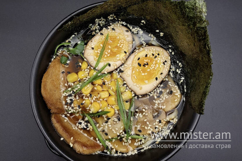 Бульйон рамен, локшина удон, мариновані яйця, кукурудза, монго, свинина, шампіньйони.