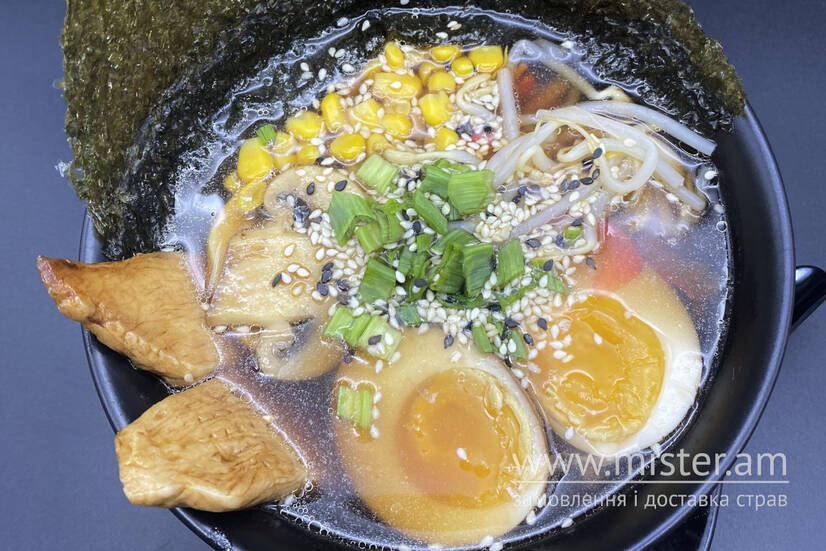 Бульйон рамен курячий, болгарський перець, локшина удон, мариновані яйця, кукурудза, монго, філе куряче, морква, шампіньони.
