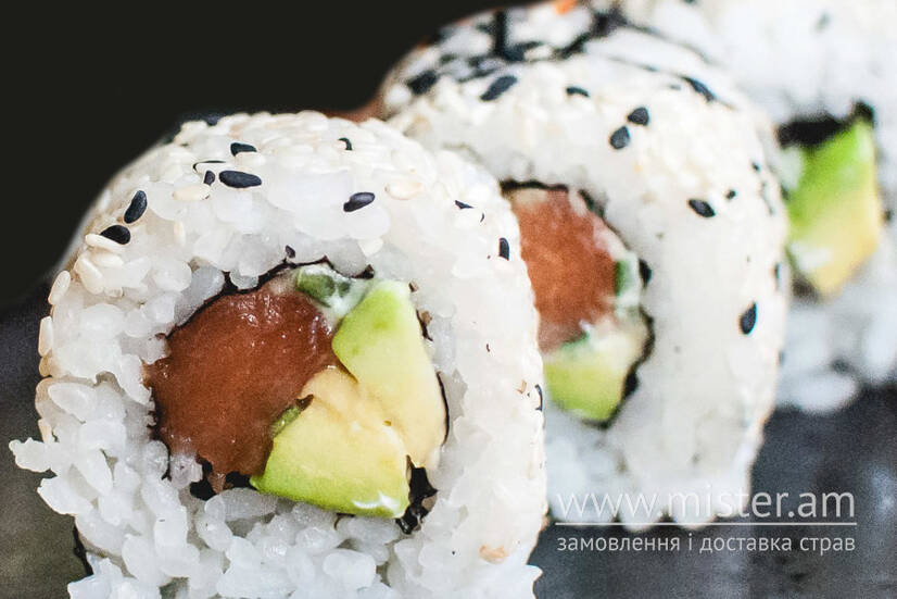 Рис, свіжий лосось, огірок, авокадо, майонез спайсі.