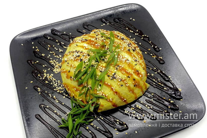 Рис, болгарський перець, соус Теріякі, млинець, кунжут, зелена цибуля, морква, Унагі соус, Філе куряче.