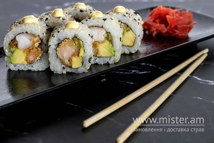 Рис, креветки Темпура, авокадо, майонез Спайсі, кунжут.