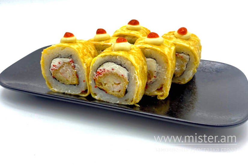 Рис, тигрова креветка, сир вершковий, млинець, ікра тобіко червона, майонез спайсі, сoyc Шрирача.