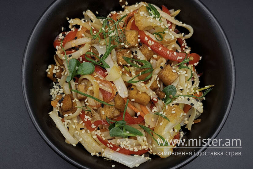 Локшина, цвітна капуста, тофу, перець болгарський, кримська цибуля, морква, кунжут, соус солодкий чілі, соус кунжутно-соєвий