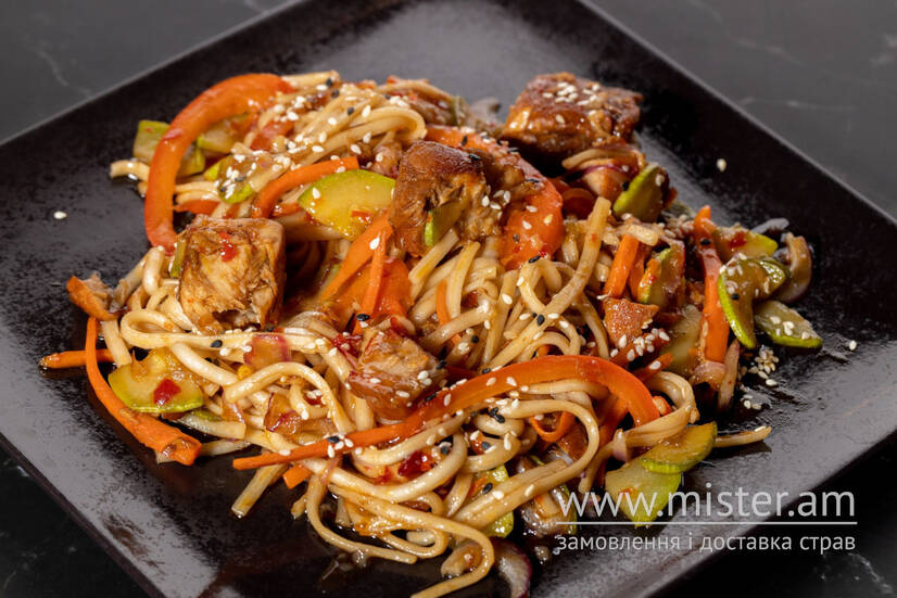 Локшина, свинина, кабачок, перець болгарський, кримська цибуля, морква, кунжут, соус солодкий чілі, соус кунжутно-соєвий.