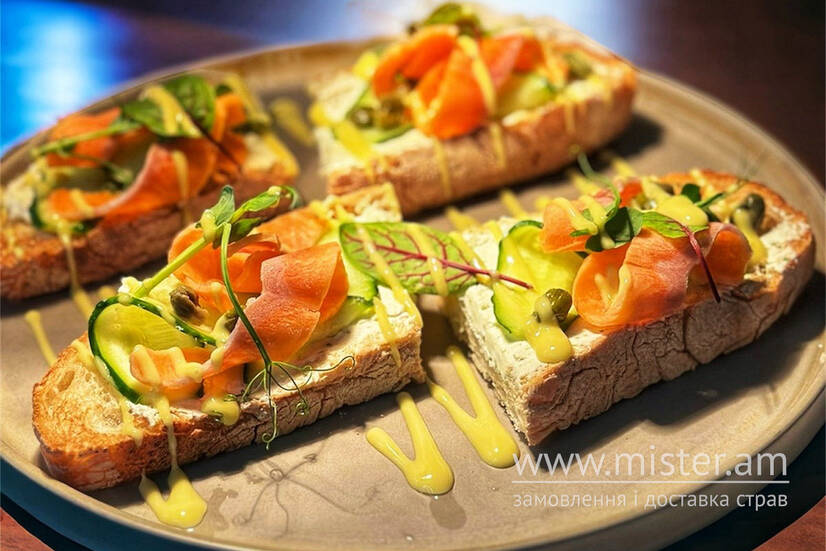 Крем-сир з песто, свіжий огірок, каперси, слабосолений лосось, цитрусовий соус.