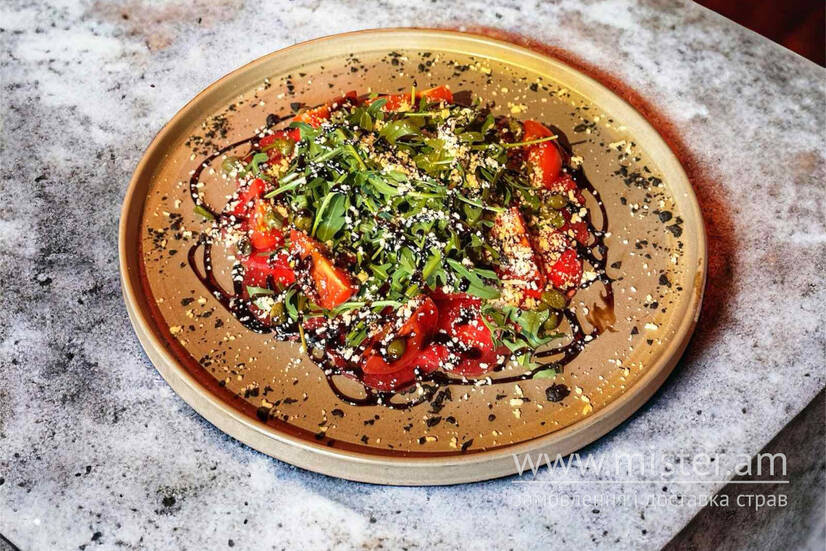 Класичне карпаччо з яловичини на соусі дорблю, томати черрі, рукола, сир пармезан.