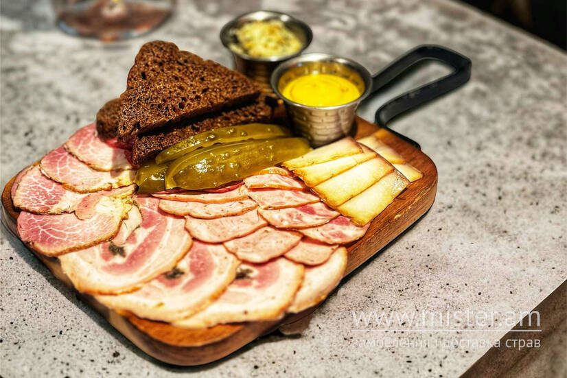 Смалець зі шкварками, сало копчене, ковбаса дрогобицька, ковбаса тірольська, шинка, ковбаса задимлена, рулет домашній, подається з грінками, огірками та гірчицею.