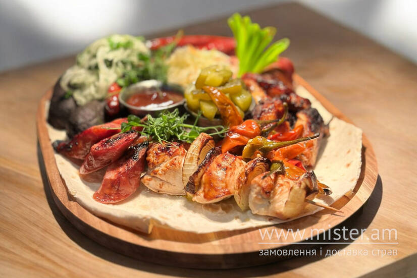 Курячий шашлик на шпажці, курячі крильця, яловичий язик в соусі унагі, запечена ковбаска, свинні медальйони в беконі, кров’янка, сосиски кабаноси, зимові соління. Подається на листі з лавашу з соусом барбекю.