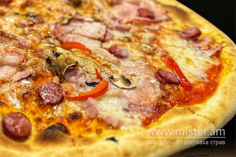 Томатний соус, мисливські ковбаски, шинка, печериці, печений болгарський перець, моцарелла.