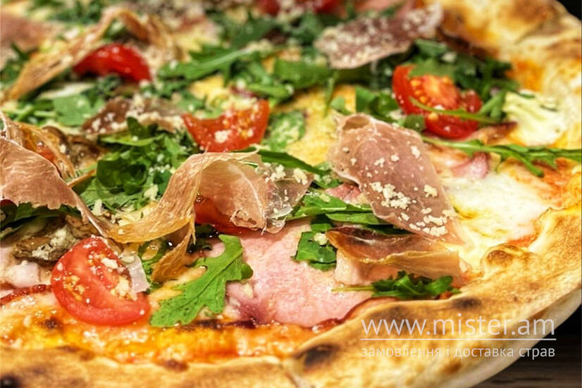 Томатний соус, вершковий соус, бекон, шинка, дорблю, рукола, сировялена шинка, білі гриби, козячий сир, томати черрі, моцарелла.