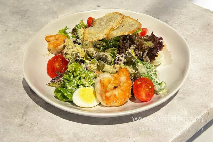 Листя салату, томати черрі, яйця перепелині, креветки з соусом Цезар, пармезан і розмаринові крутони.