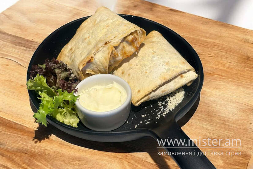 Лаваш, куряче філе, цибуля ріпчаста, сир чеддер, помідор, мікс салатів, соус американський, айолі, часниковий.