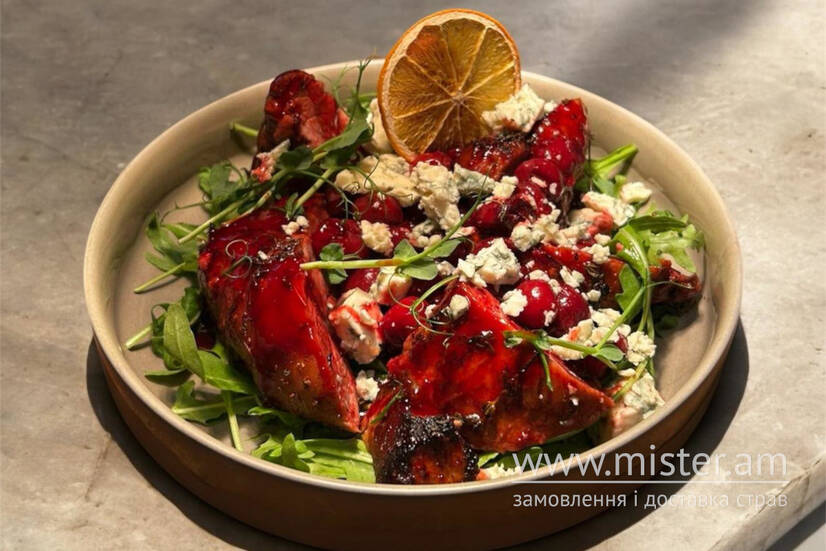 Свинна вирізка та вишневий соус з вишнями. Подається на подушці з руколи та посипається сиром дор блю.