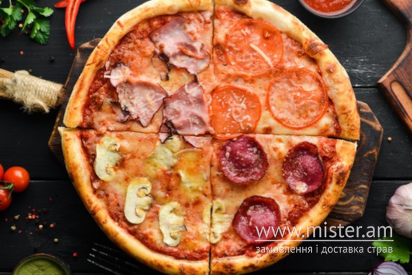 Італійські томати, моцарела, печериці, пепероні, шинка, помідор, пармезан.