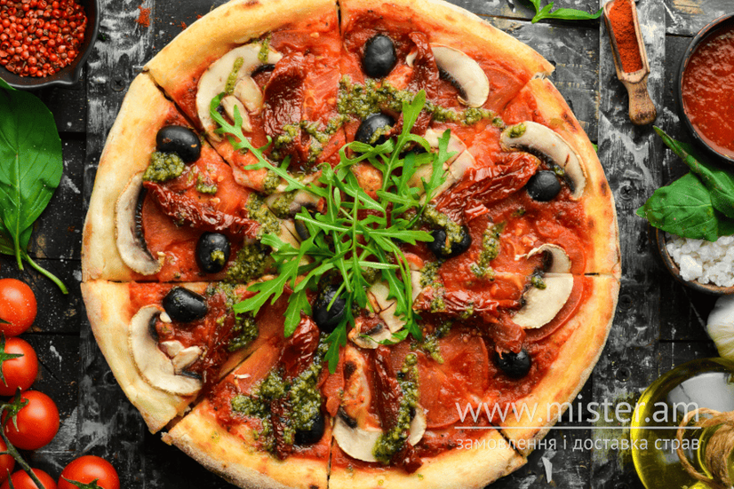 Томатна основа, помідори, рукола, печериці, вялені томати, оливки, соус песто, часникова олія.