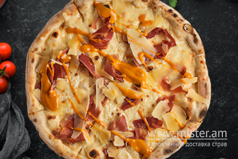 Вершкова основа, моцарела, італійське мясо, ді парма, пармезан, соус манго чілі.