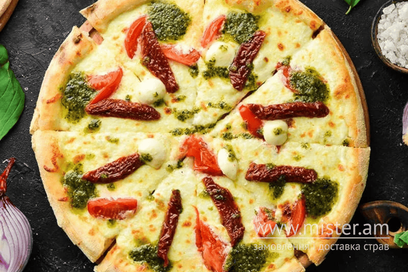 Вершкова основа, моцарела, помідори черрі, вялені томати, соус песто.