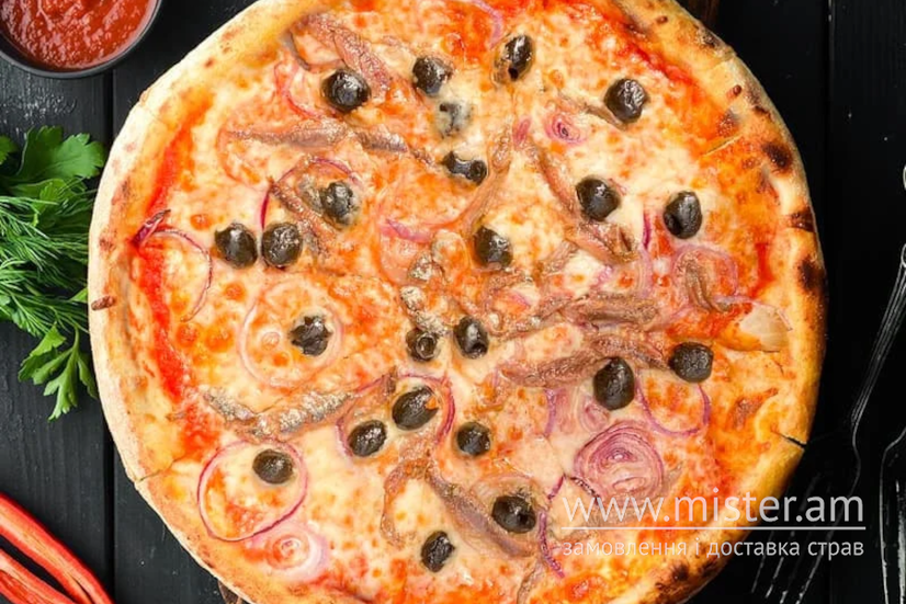 Томатна основа, моцарела, анчоуси, маслини, цибуля.