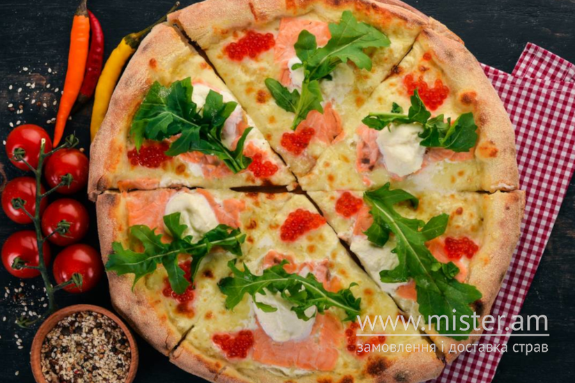 Вершки, моцарела, лосось, рікота, червона ікра, пармезан.