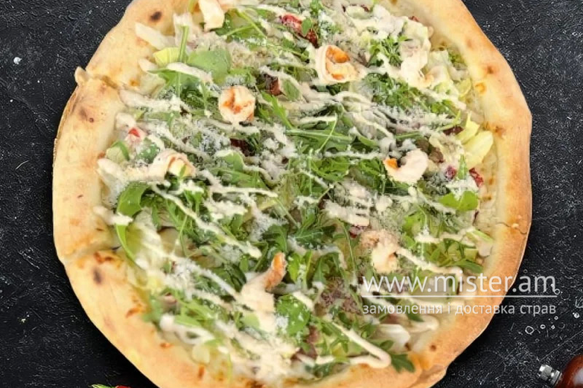 Вершкова основа, сир моцарела, креветки, бекон, пармезан, мікс салату, чері, соус цезар, 850 г.