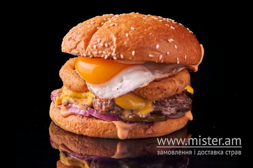 Картопляна булочка з сезамом, соковита яловича котлета, яйце смажене на грилі, цибулеві кільця в паніруванні, сир чеддер, домашні мариновані огірочки, фіолетова цибуля, секретний соус Х.