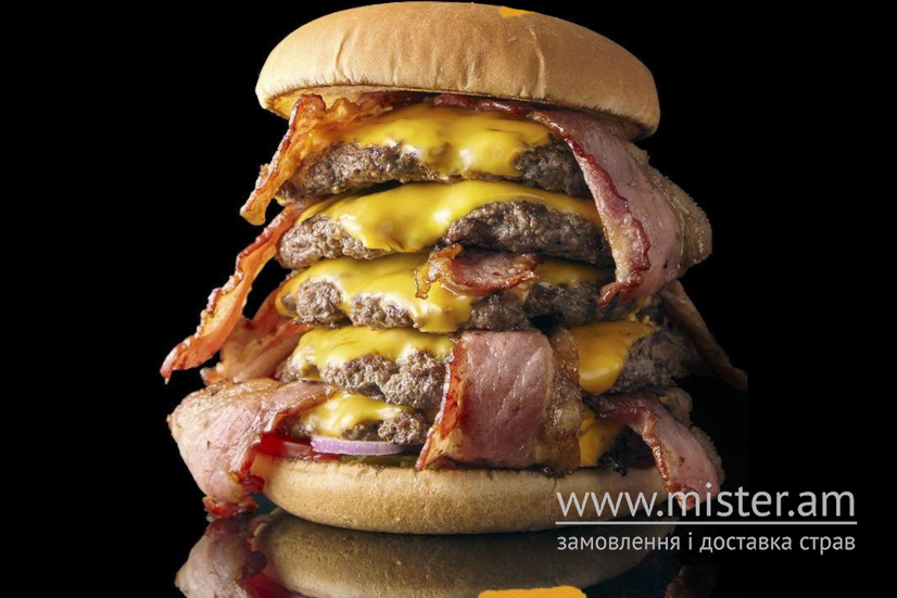Класична булочка з сезамом. чотири соковитих яловичі котлети, підсмажені скибки бекону, сир чеддер, тягуча моцарелла, домашні мариновані огірочки, скибки спілого помідору, фіолетова цибуля, кетчуп / майонез / гірчиця.