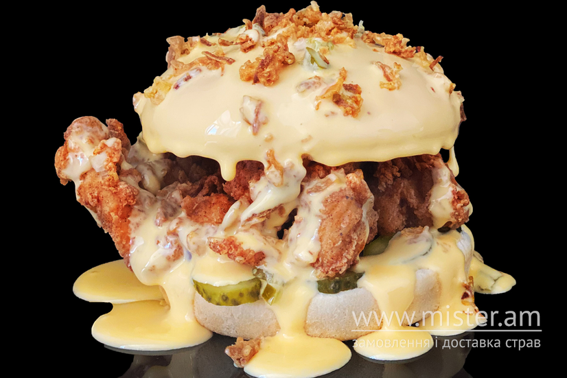 Класична булочка без сезаму, соковита куряча котлета в паніруванні, мариновані огірочки, фіолетова цибуля, карамелізована цибуля, перець Халапеньйо, цибуля кранч, соус Чедер.
