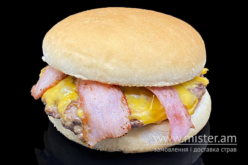 Класична булочка без сезаму, cоковита яловича котлета, сир Чеддер, домашні мариновані огірочки, скибки спілого помідору, фіолетова цибуля, підсмажені скибки бекону, кетчуп/майонез/гірчиця.