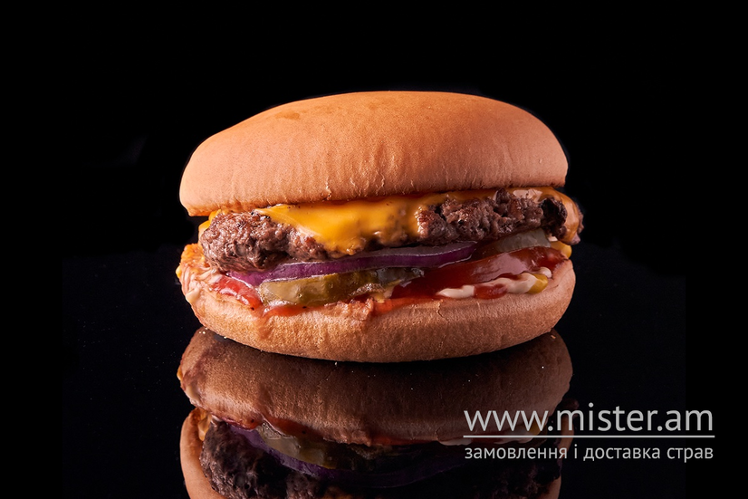 Класична булочка без сезаму, соковита яловича котлета, сир чеддер, домашні мариновані огірочки, скибки спілого помідору, фіолетова цибуля, кетчуп / майонез / гірчиця.