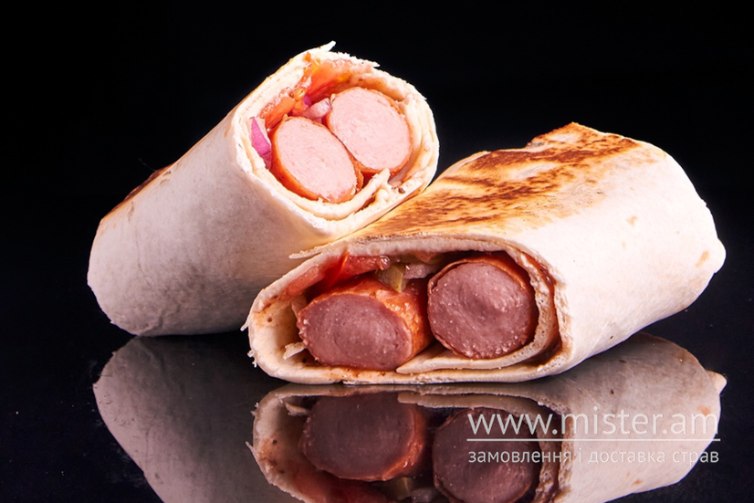 Пшенична тортилья, дві класичні сосиски, домашні мариновані огірочки, скибки спілого помідору, фіолетова цибуля, соус.