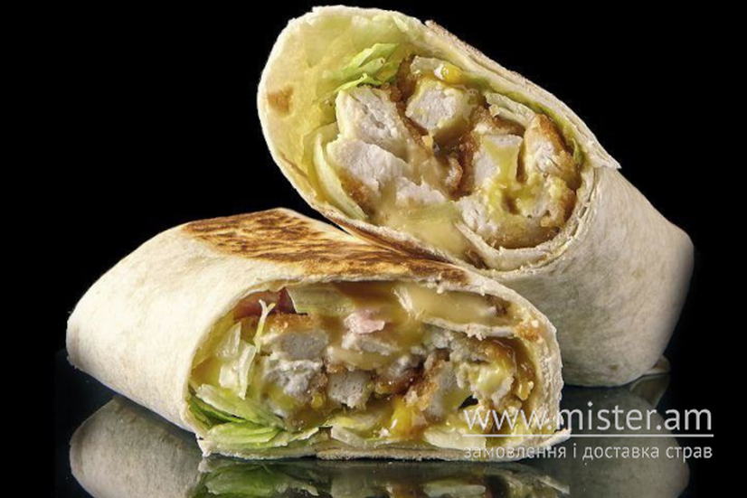 Пшенична тортилья, котлета з курятини з твердим сиром та шинкою, хрусткий салат айсберг, медово-гірчичний соус.