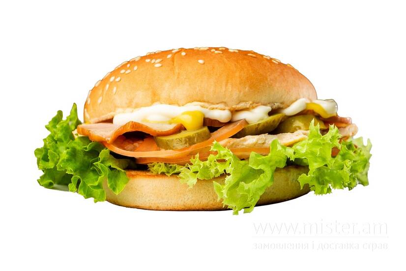Запечена на грилі скибочка соковитого бекону та ніжного курячого філе із запашною здобною булочкою, в поєднанні зі свіжим салатом, кружальцями маринованого огірка та свіжого томату, приправлені ніжним майонезом та американською гірчицею