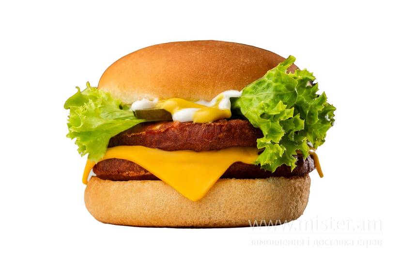 Опис бургера з України: булка без кунжуту, листя салату, огірок маринований, 2 курячі котлети, сир тостовий, часниковий соус, гірчиця американська.