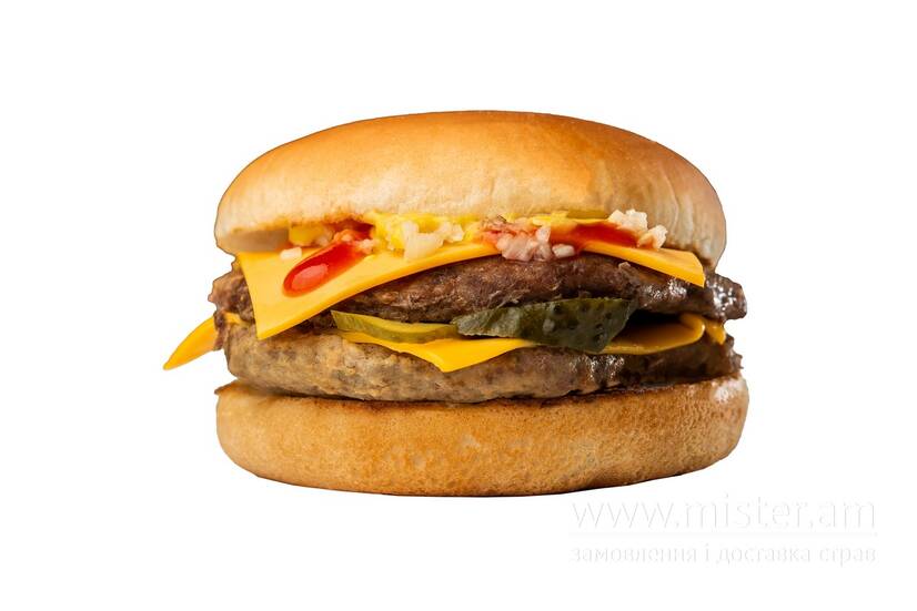 Дві відбірні високоякісні яловичі котлети із запашною булочкою, в поєднанні з двома скибочками сиру Чеддер, соковитою цибулею та хрустким маринованим огірком, приправлені кетчупом та американською гірчицею